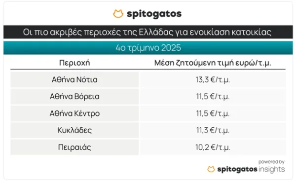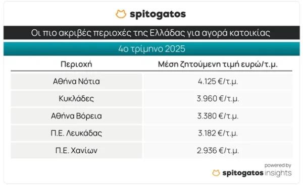 Τα Νότια Προάστια αναδεικνύονται και πάλι η πιο ακριβή περιοχή της χώρας για αγορά και ενοικίαση κατοικίας κατά το 4ο τρίμηνο του 2025 ενώ σε Π.Ε. Καστοριάς και Πέλλας οι πιο οικονομικές επιλογές – Σημαντική ετήσια αύξηση στην τιμή πώλησης κατοικίας σε Θεσσαλονίκη