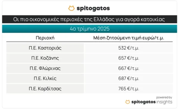 Στον αντίποδα, τα πιο οικονομικά σημεία της χώρας για αγορά κατοικίας είναι η Π.Ε. Καστοριάς με ΜΖΤ πώλησης κατοικίας στα 532 ευρώ/τ.μ., ενώ ακολουθούν οι Π.Ε. Κοζάνης, Φλώρινας, Κιλκίς και Καρδίτσας.