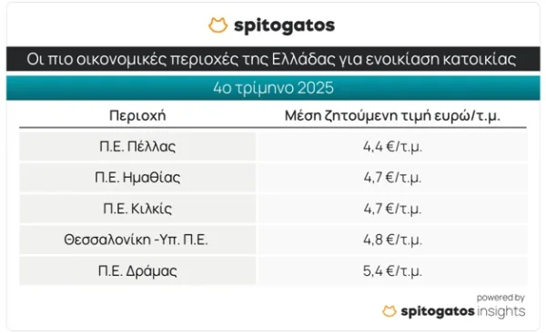 Τα οικονομικότερα σημεία της Ελλάδας για ενοικίαση κατοικίας κατά το 4ο τρίμηνο του 2025 είναι οι Π.Ε. Πέλλας, Ημαθίας, Κιλκίς, το Υπόλοιπο της Περιφερειακής Ενότητας Θεσσαλονίκης και η Π.Ε. Δράμας.
