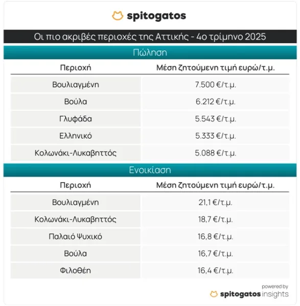 Σε ό,τι αφορά την ενοικίαση κατοικίας, και για το 4ο τρίμηνο του 2025, η Βουλιαγμένη αναδεικνύεται ως η ακριβότερη περιοχή της Αττικής, με ΜΖΤ ενοικίασης στα 21,1 ευρώ/τ.μ., τιμή αυξημένη κατά 5,7% σε σύγκριση με το 4ο τρίμηνο του 2024. Ακολουθούν οι περιοχές Κολωνάκι-Λυκαβηττός, Παλαιό Ψυχικό, Βούλα και Φιλοθέη, με ΜΖΤ που διαμορφώνεται στα 16,4 ευρώ/τ.μ. Στη Φιλοθέη καταγράφεται μείωση -8,0% σε ετήσια βάση, ενώ οι υπόλοιπες περιοχές της πρώτης πεντάδας σημειώνουν ετήσιες αυξήσεις που κυμαίνονται μεταξύ 2,9% και 12,0%.