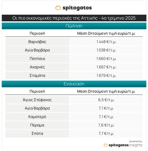 Οι πιο οικονομικές περιοχές για ενοικίαση κατοικίας στην Αττική κατά το 4ο τρίμηνο του 2025 είναι ο Άγιος Στέφανος στα Βόρεια Προάστια της Αθήνας, με ΜΖΤ στα 6,5 ευρώ/τ.μ., η Αγία Βαρβάρα και το Καματερό στα Δυτικά Προάστια, το Πέραμα στα Προάστια του Πειραιά και τα Σπάτα στην Ανατολική Αττική.