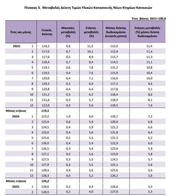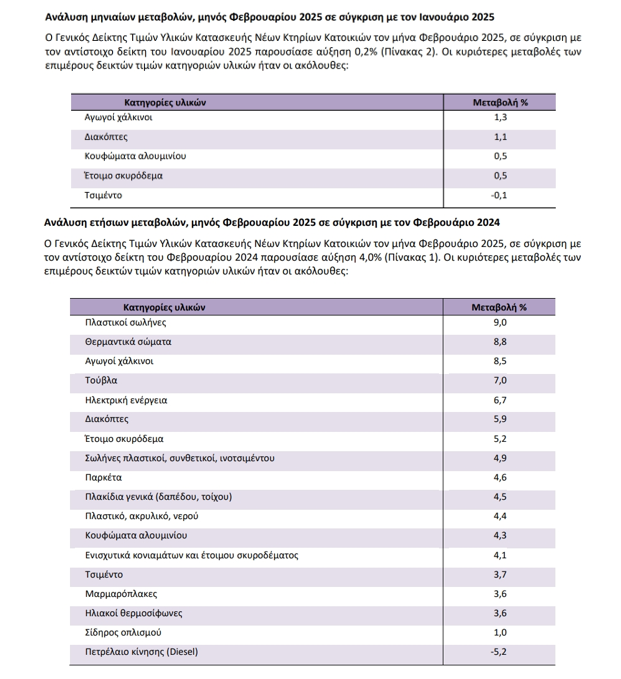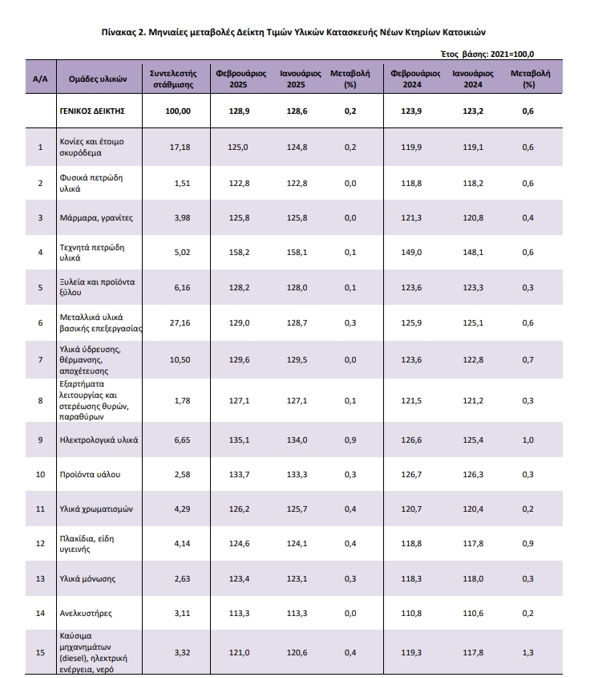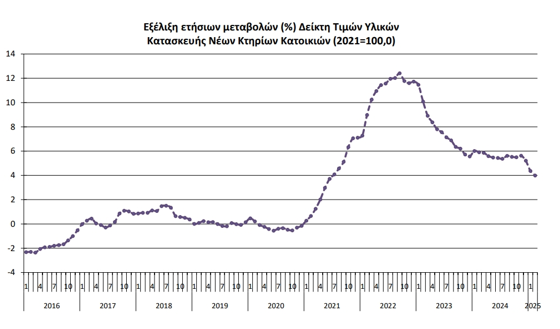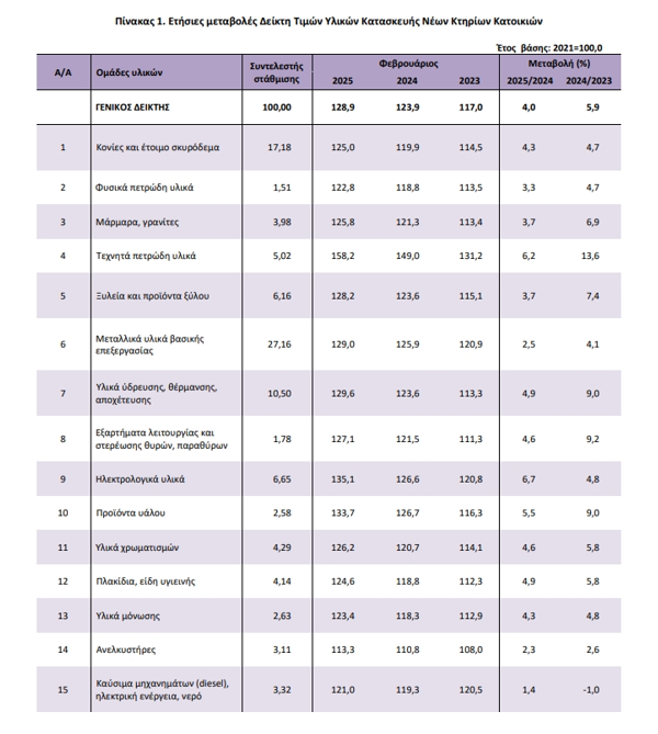 Σημαντική αύξηση σημείωσαν οι τιμές υλικών κατασκευής νέων κατοικιών τον προηγούμενο μήνα, σύμφωνα με στοιχεία της ΕΛΣΤΑΤ. Συγκεκριμένα, τον Φεβρουάριο 2025, σε σύγκριση με τον αντίστοιχο δείκτη του Φεβρουαρίου 2024 παρουσιάστηκε αύξηση 4,0%, έναντι αύξησης 5,9% που σημειώθηκε κατά τη σύγκριση των αντίστοιχων δεικτών του 2024 με το 2023.